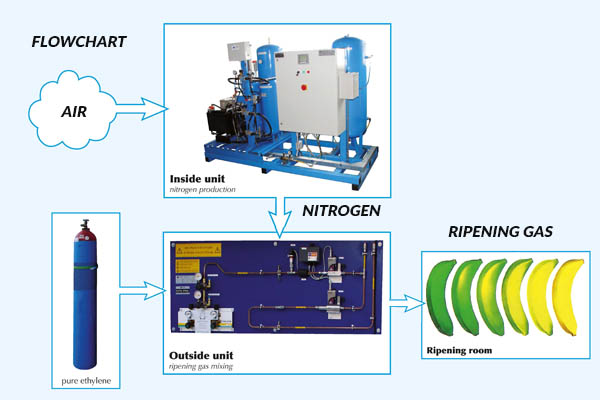 Ripe-pro is an installation for producing ripening gas. Standard pre-mixed gas consists of 95% nitrogen and 5% ethylene. Ripe-pro extracts nitrogen from fresh air and mixes it with pure ethylene (out of gas bottles). This mixed gas can then be used for the ripening of bananas and other fruit. So you do not need standard pre-mixed gas anymore.